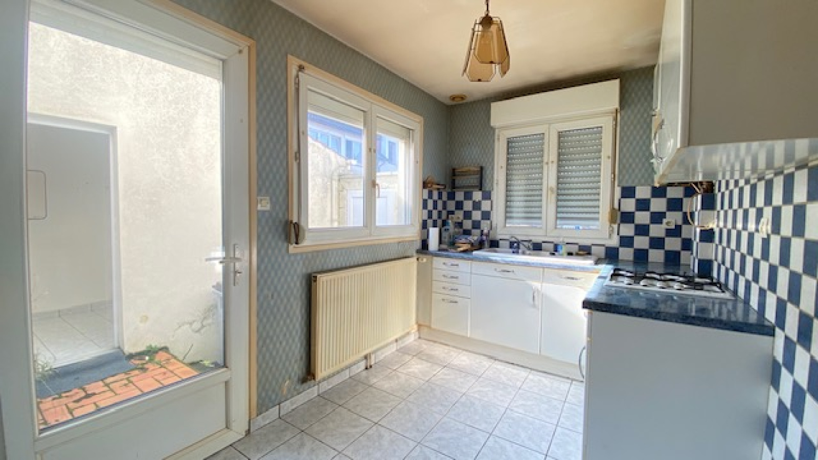 Axe gare, port, commerces, maison de ville semi-individuelle composée d'une unité de vie, une cuisine, une salle de bains, wc. A l'étage : palier, deux chambres.